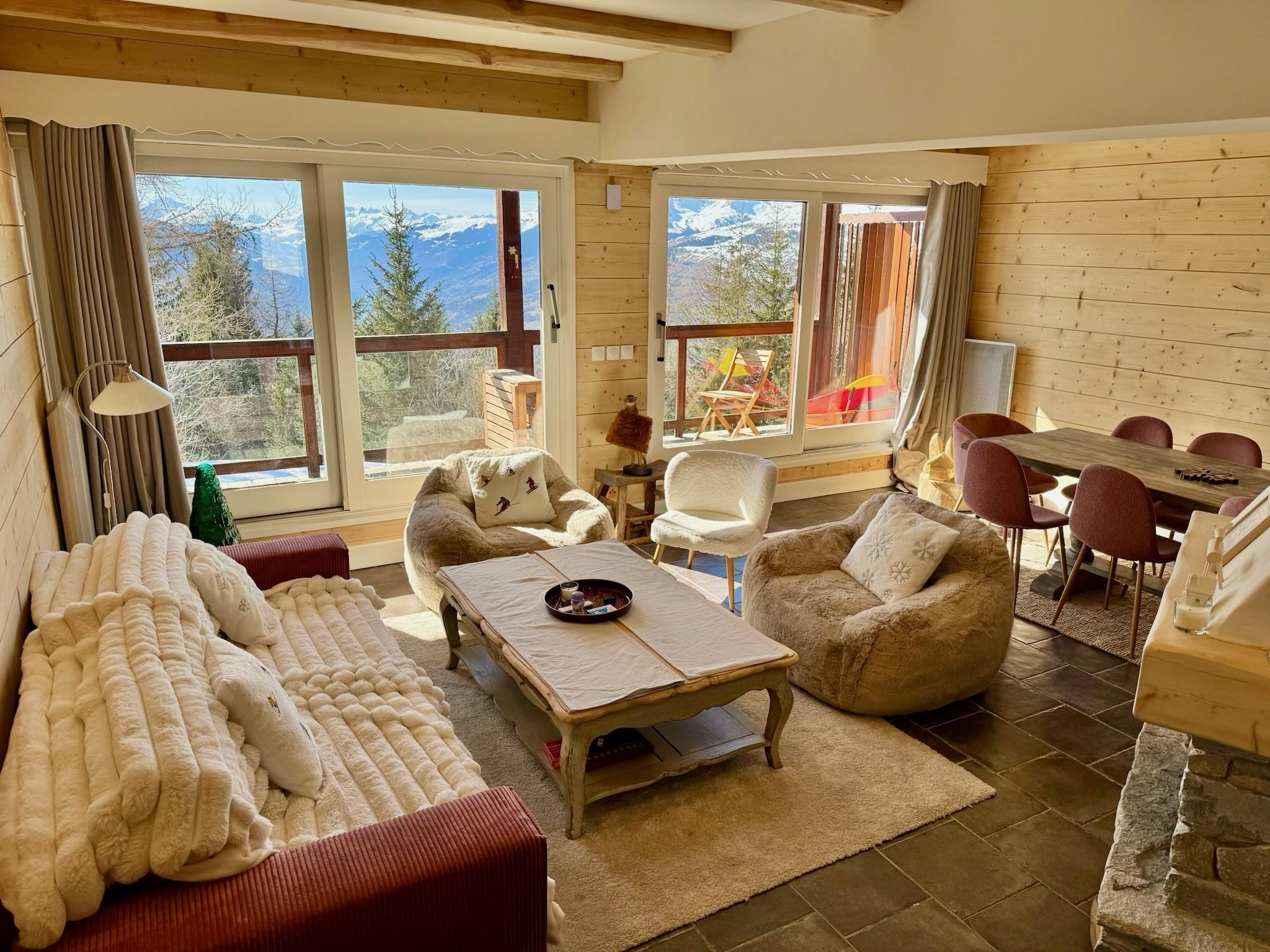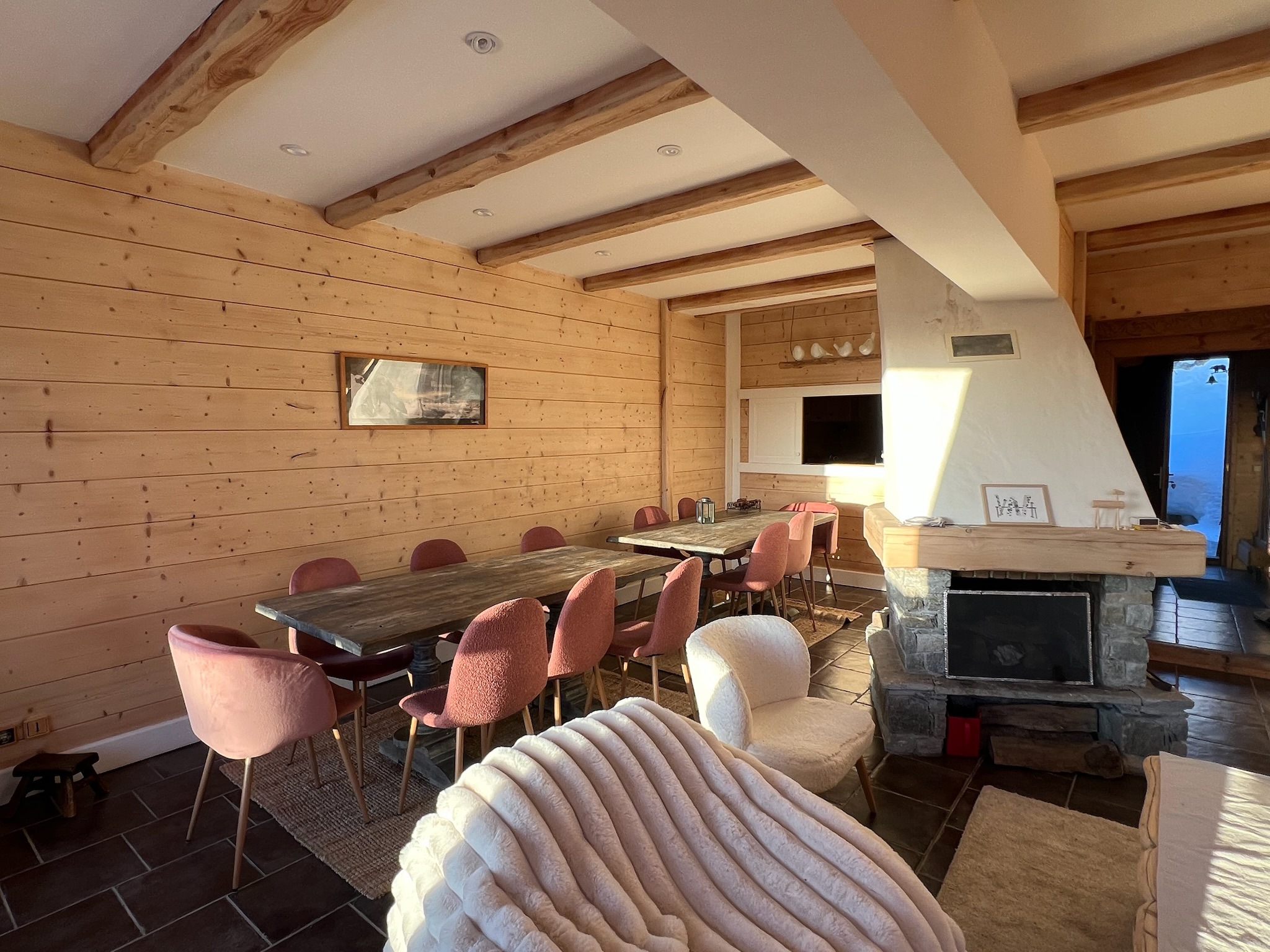Salon / salle à manger avec cheminée, deux grandes tables (10 personnes), canapés, télévision et vue panoramique sur la vallée